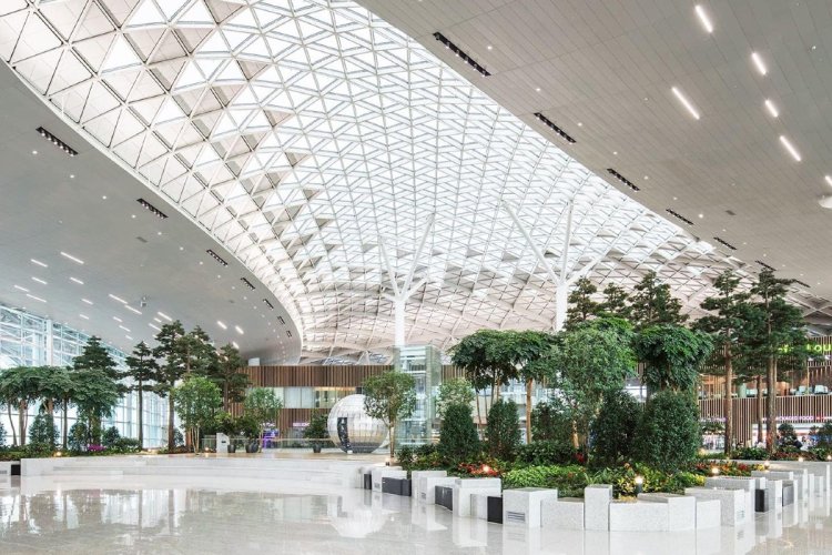 Thanks to its intelligent layout, it takes no more than eight minutes to walk from check-in to the farthest gate. Daxing operates as a “smart terminal” — with facial recognition, automated baggage systems, and eco-friendly lighting.